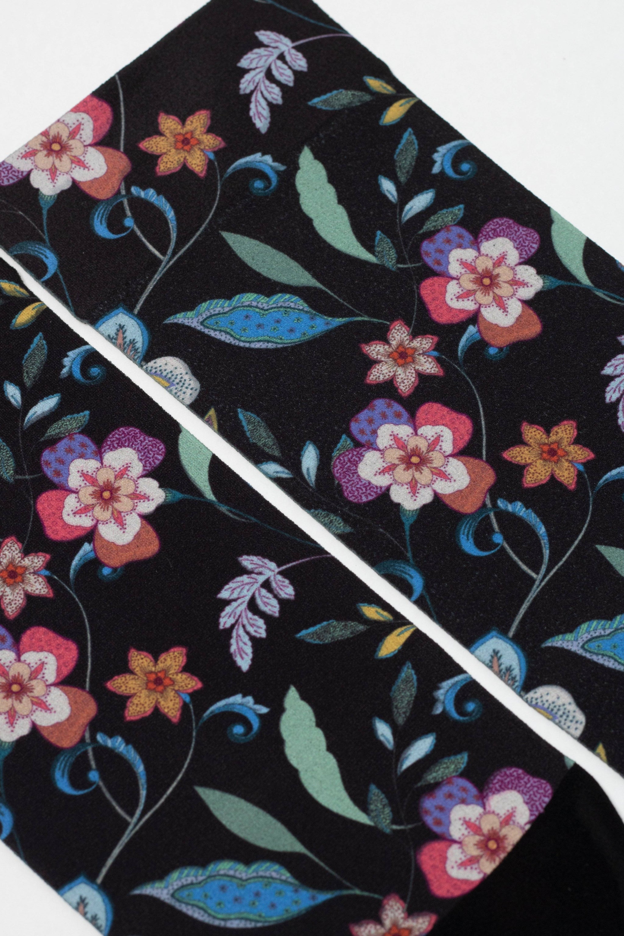 These dense socks FANTASY with a vibrant, long-lasting floral print applied by thermal transfer printing are a bold and stylish accent for everyday outfits. The black toe and minimalist no-heel cut add contrast and individuality.