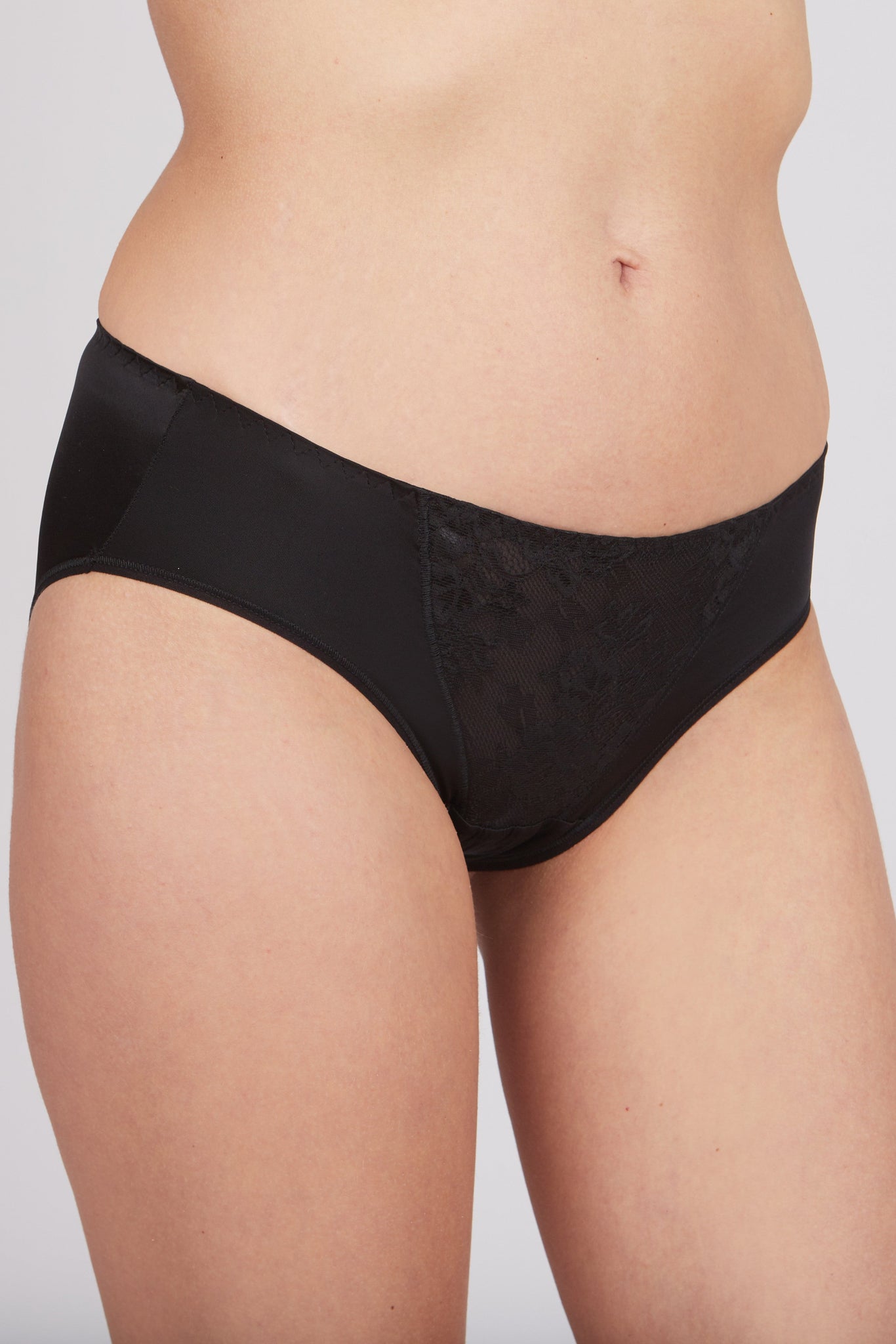 Culotte panties with a medium waistline made from elastic fabric and lace fabric. Culottes are similar to briefs but feature a deeper cut on the front leg, fit more snugly to the body, and do not extend to the line of the curve. A matching bra can be used to complete the set.